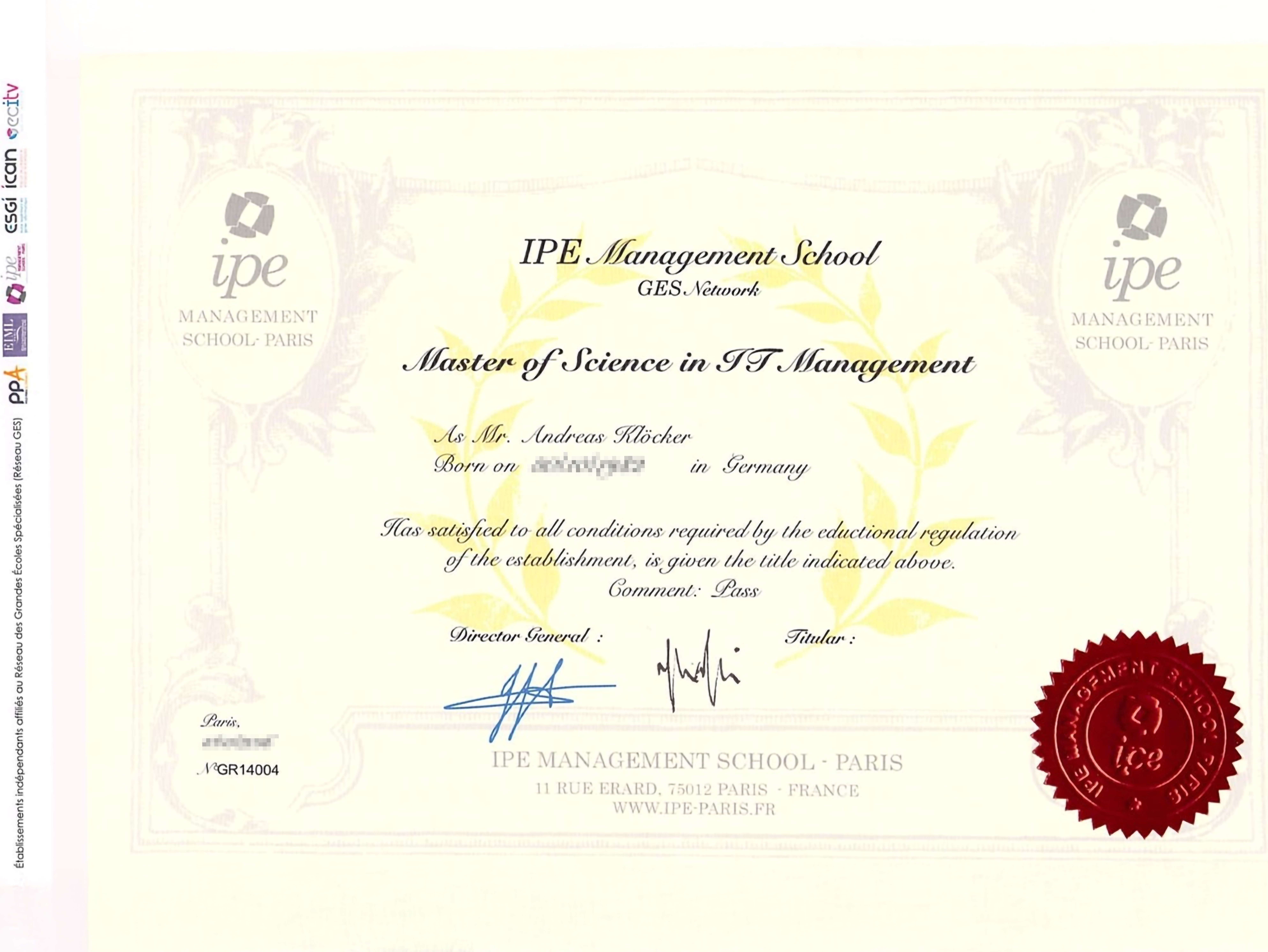 2012 – 2015: GES Paris Wirtschaftsinformatik (Abschluss: Master of Science)
